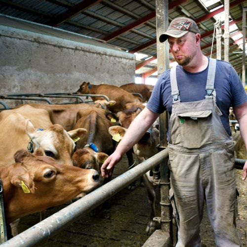 Staldene, som gennem tiden er blevet bygget meget større, rummer i dag 350 Jerseykøer med opdræt. Der har altid været jerseykøer på gården og besætningen er bygget op over den stambesætning , som Jespers farfar og farmor købte for snart 100 år siden.